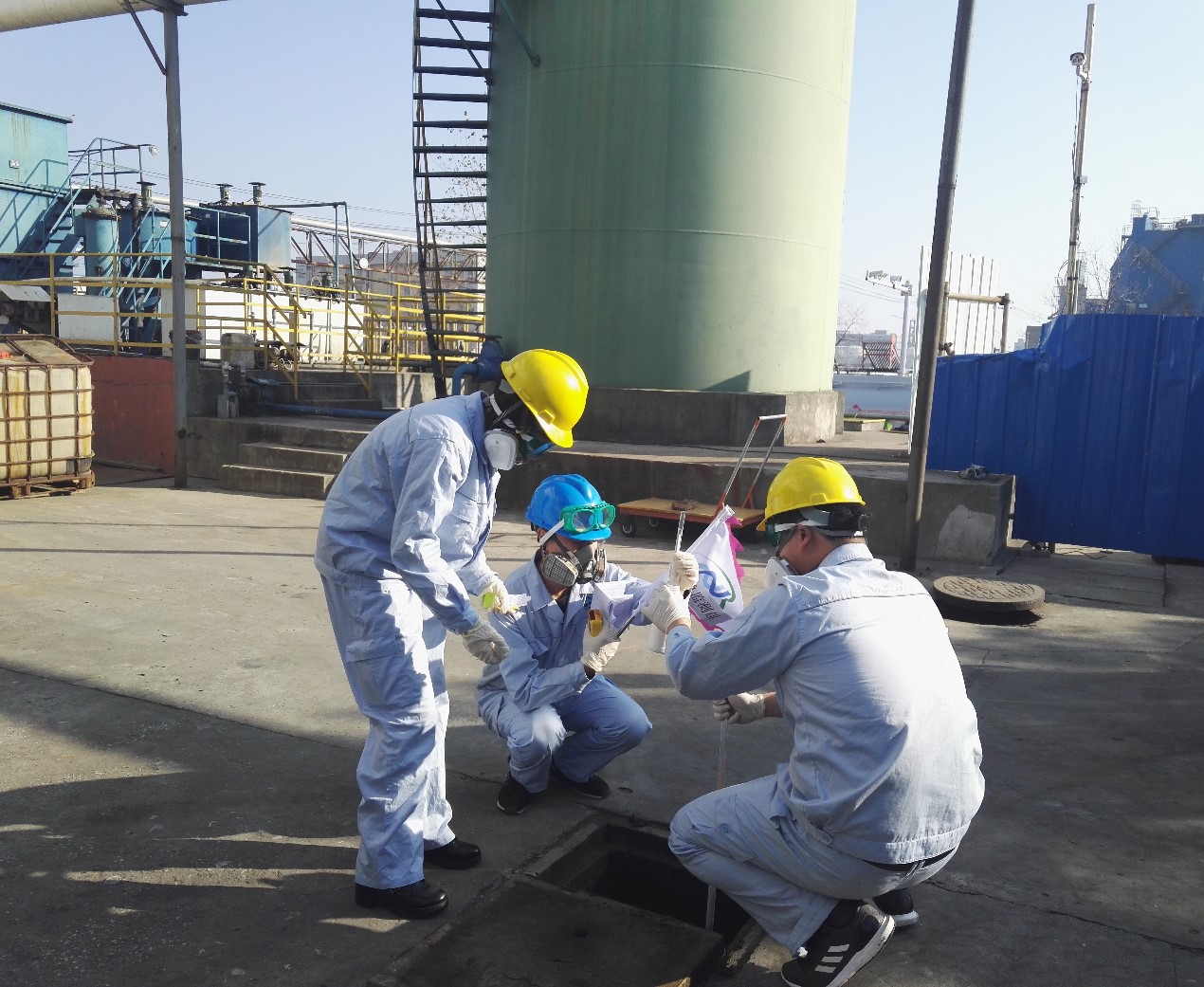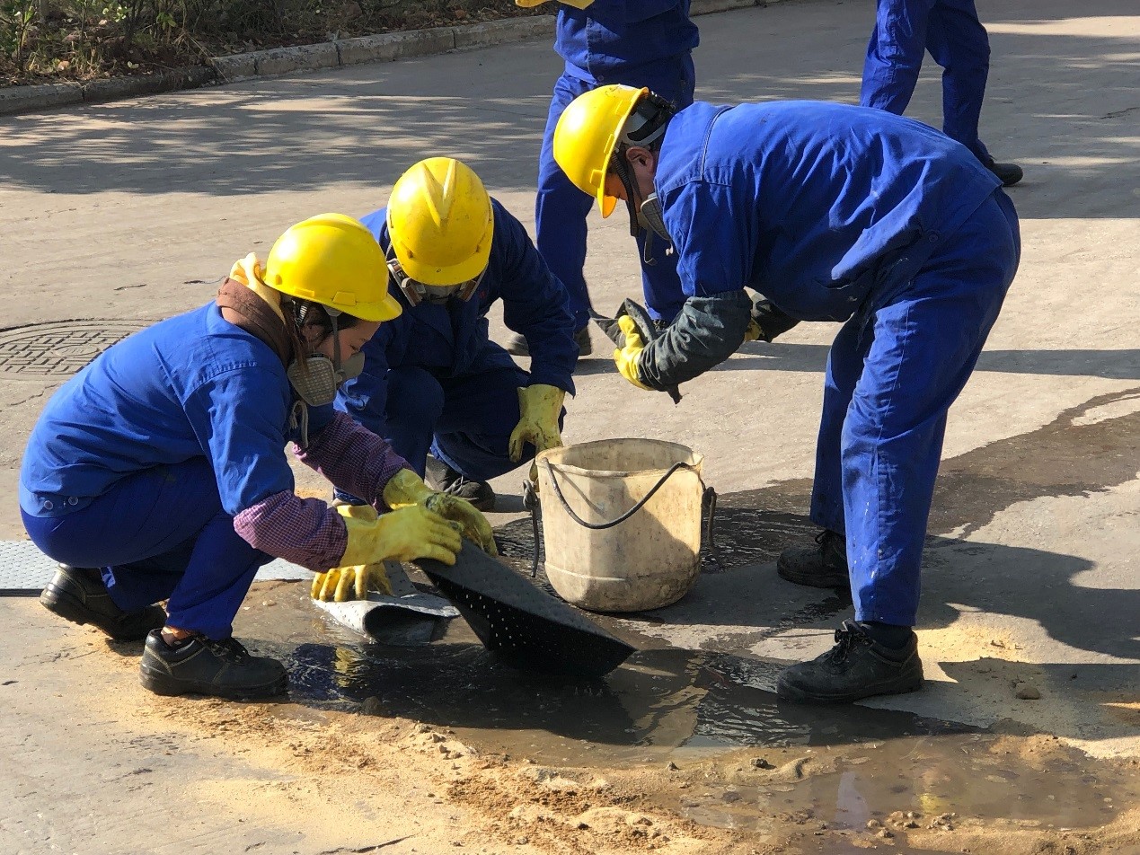 叉車卸料到1號釜旁,噸桶跌落,意外破裂,發(fā)生泄漏,人員按照《泄漏處理操作規(guī)程》實(shí)施堵漏作業(yè)。